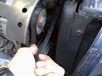 ファンベルトの点検 ファンベルトが緩んでいないかチェックする。 プーリーの中間を指で押してみて10mmくらい動く程度がちょうどいい張り具合… 緩みすぎると、エンジンを始動したとき「キュルルル…」を悲鳴を上げる事で有名です。(笑)
