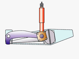 上の図はフロントの緩衝系統と操舵系統を上から見た図で、青い部分が緩衝駆動系統の部分で、赤い部分は操舵駆動系統の部分です。操舵系統については、より突っ込んだ説明が必要ですので、ココとココをクリックして参照にしてください。 |